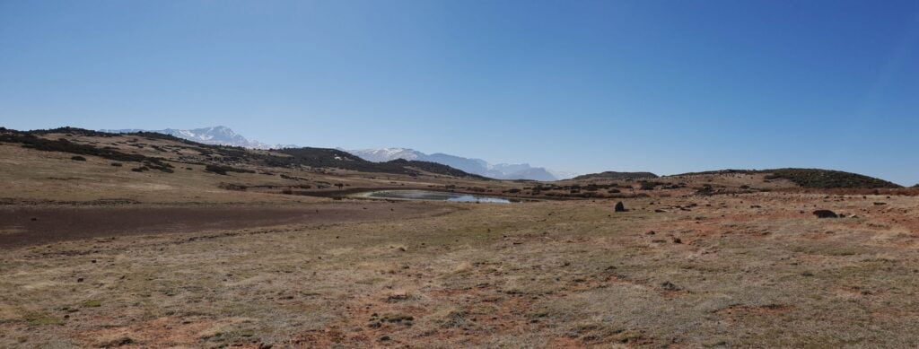 Les petits lacs du Tissiyi sont bien secs cette année , hélas ! Comme chaque année, nous montons sur ce plateau, sous la conduite éclairée et patiente de Claire . Ce dimanche, à Tidili le matin, la gelée blanche couvrait le sol ! Premiers rayons de soleil à la pause sous le village d’Igrawn , puis montée en admirant la vue sur le “Tasghimout des Almoravides” et les “cuvettes” de Tidili ( voir commentaire) . Au-dessus de Tigardi , la montée devient plus sérieuse, entre rochers de grès rouge et buissons de “cistes à feuilles de lauriers”. Au bord du plateau, versant sud, la belle vue sur les sommets ( Bou Oughioul, Meltsen, Yagour, etc, jusqu’à l’Ouka) montre une neige bien moins abondante que les années précédentes . Et les petits lacs sont bien tristounets ! A la descente, les fougères-aigles sont sèches. Et nous retrouvons les terrasses de culture bordées de grands frênes émondés pour le fourrage, aux formes étranges , puis les gros chênes-liège ( voir les fiches chêne-liège … et aussi…) , puis après la descente dans les “cistes de Montpellier” la kasba du caïd Allal Bou Khobza.